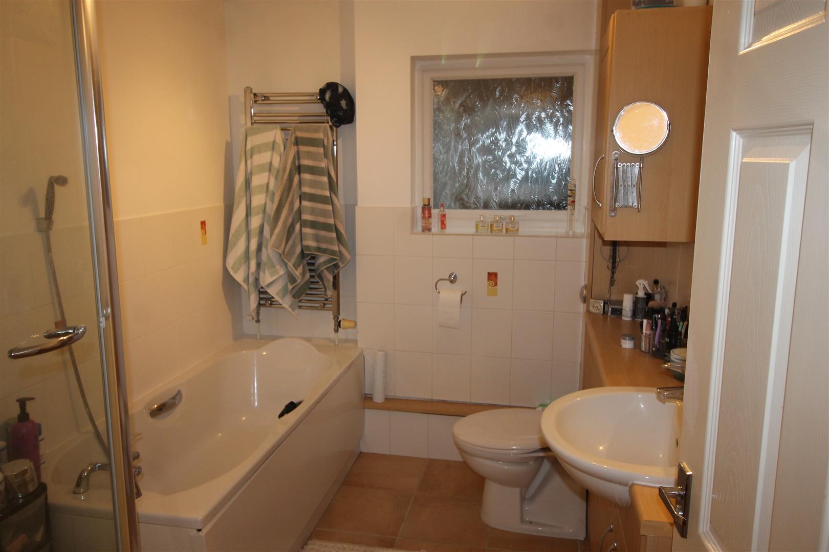 Fitted bathroom comprising a white three-piece suite including panel enclosed bath with shower over, low level WC, wash hand basin and tiled surrounds.