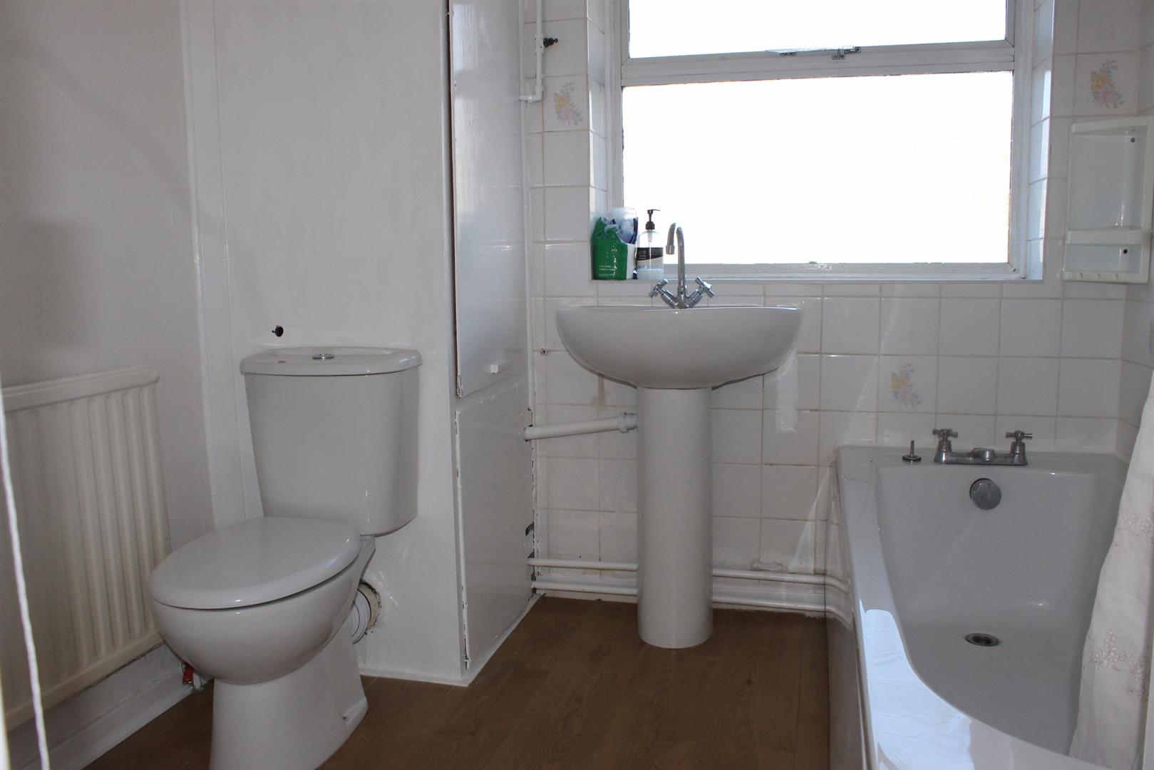 Window to rear aspect, laminate flooring, panelled bath with overhead shower, pedestal wash hand basin, low-level WC, partially tiled walls.