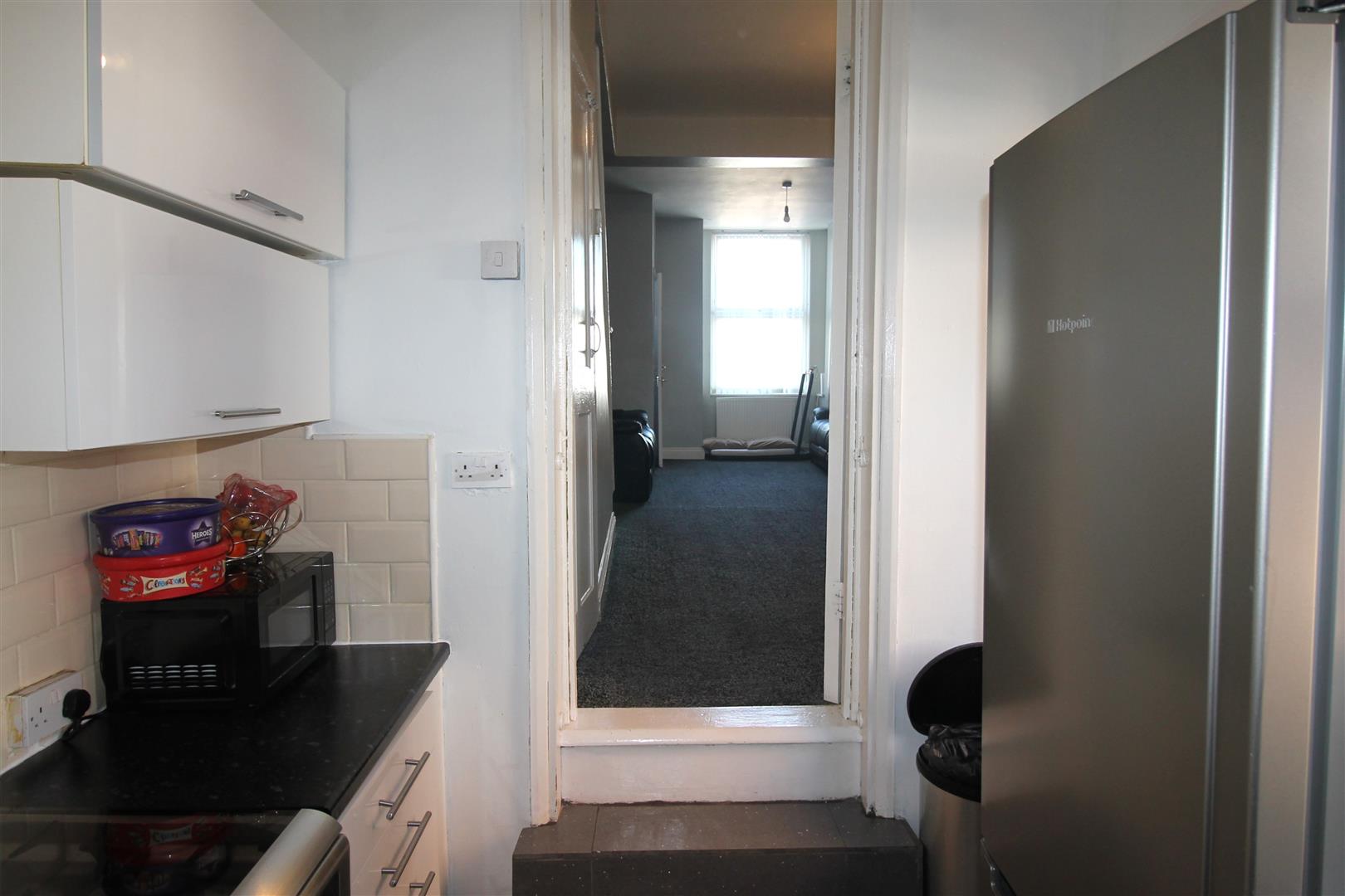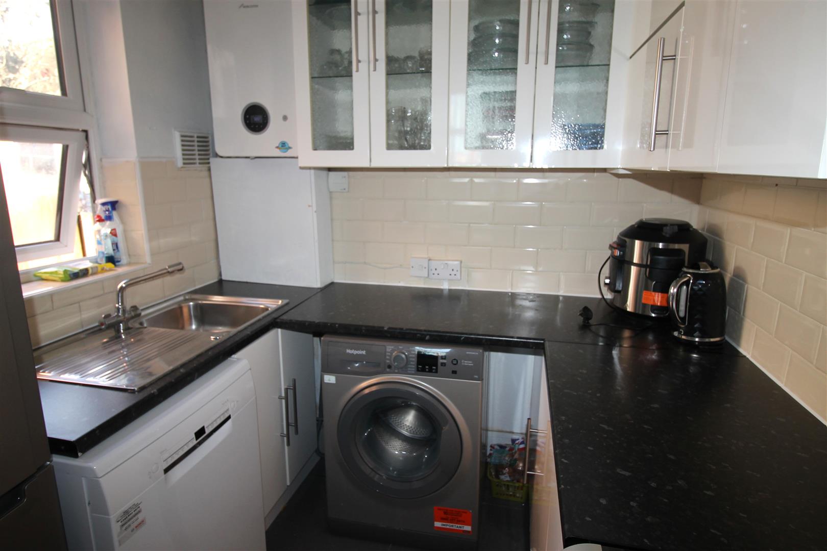 A fitted kitchen with a range of wall and base units, leading directly to the enclosed rear garden. Designed for practical and contemporary living, it offers space for appliances and work surfaces, perfect for day-to-day use.