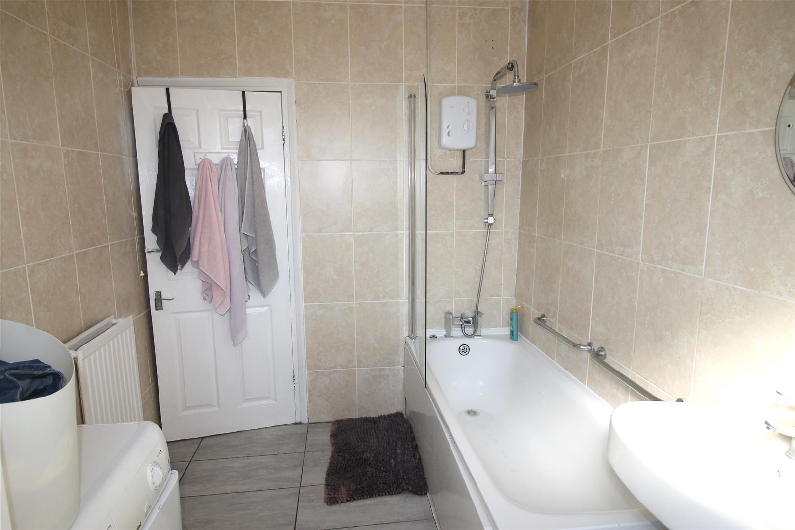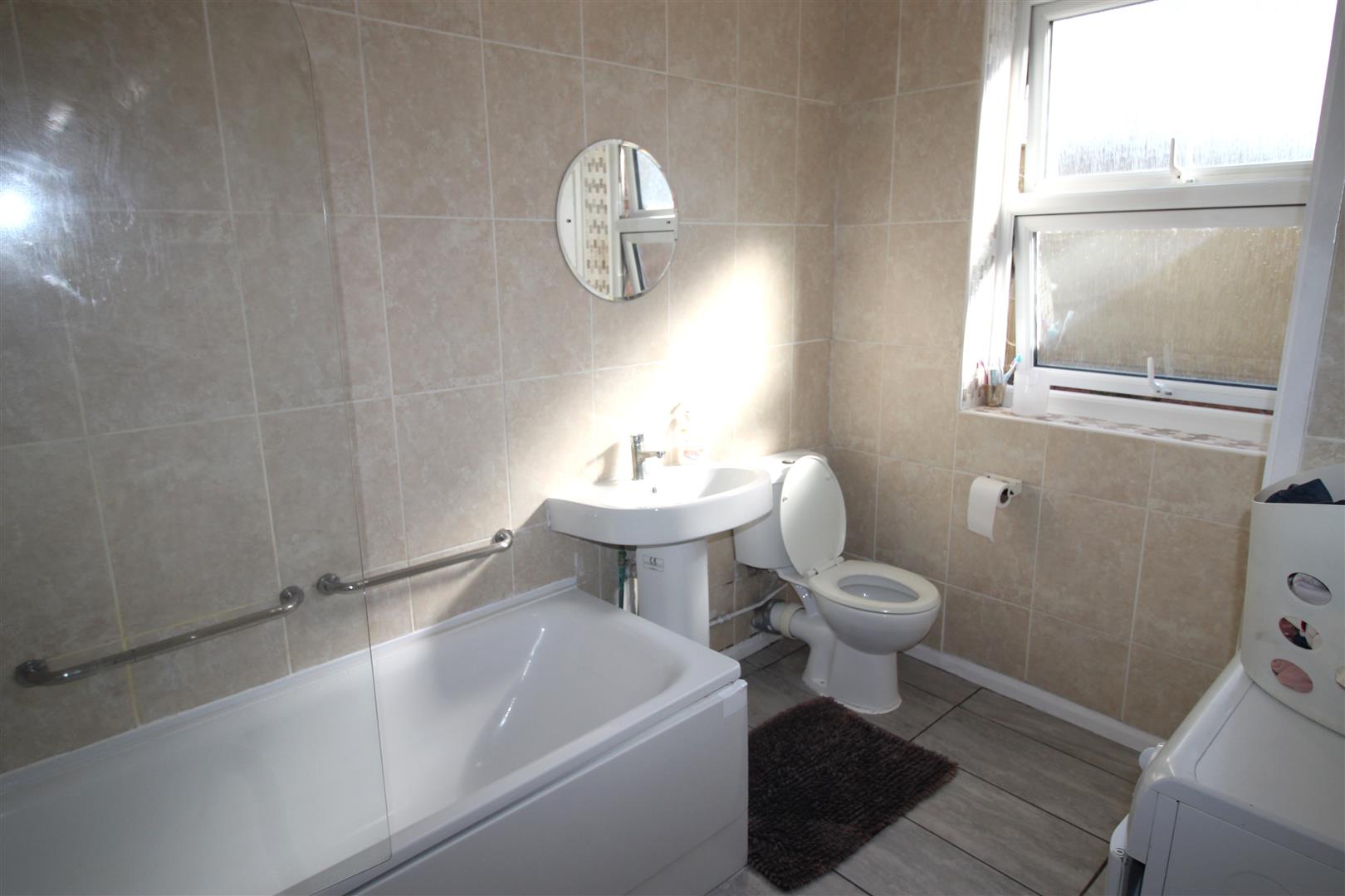 A good-sized family bathroom fitted with a three-piece suite, including a bath with shower over, WC, and wash hand basin, complemented by tiled surrounds.