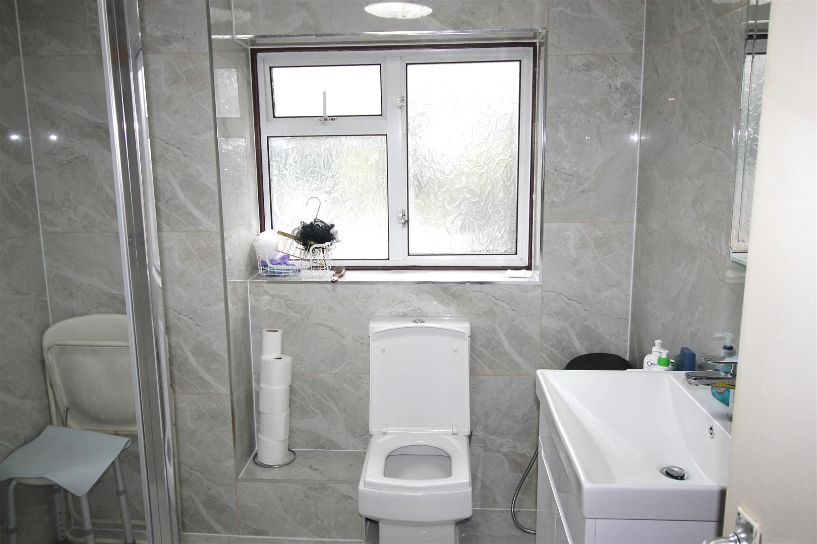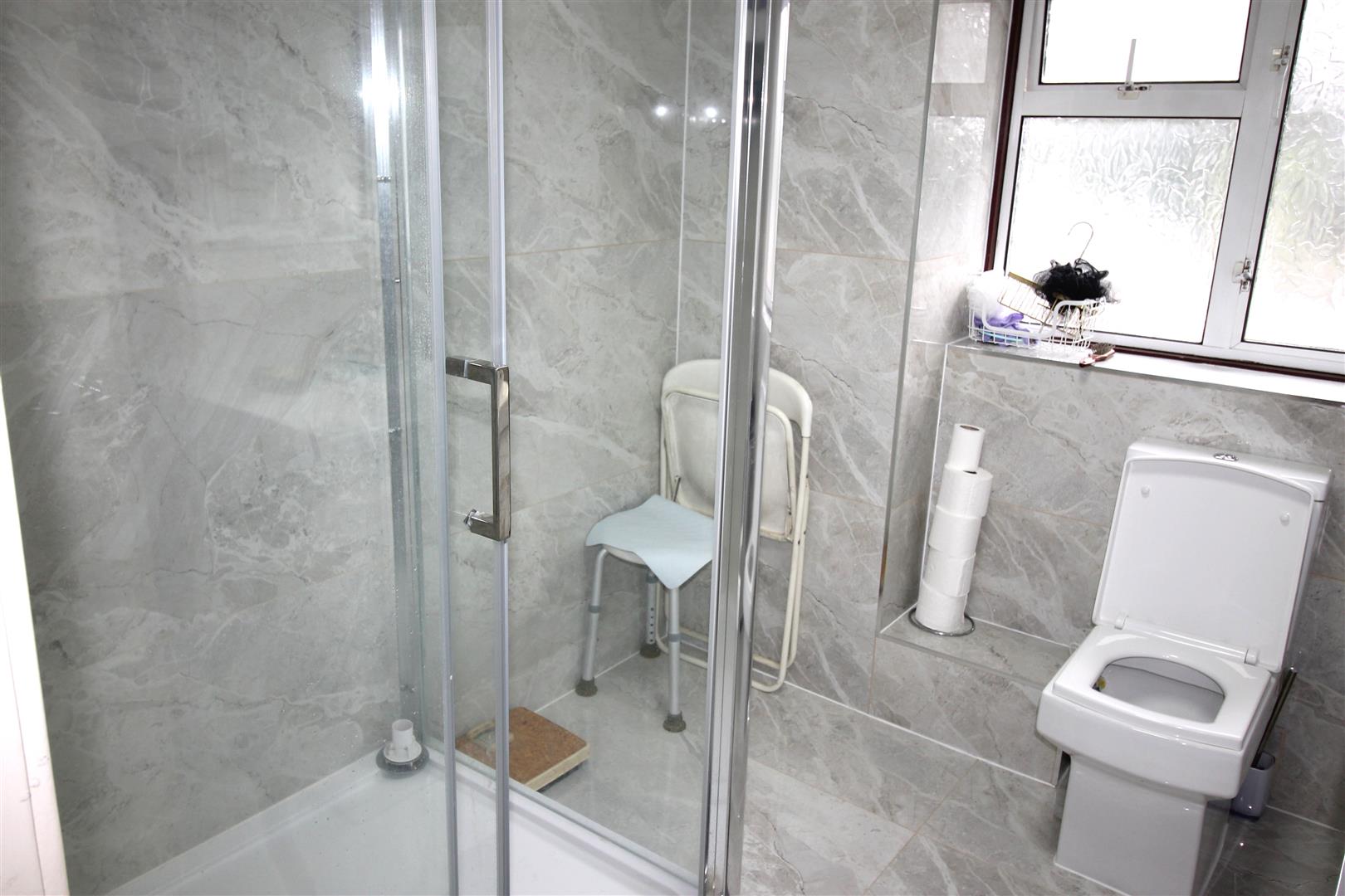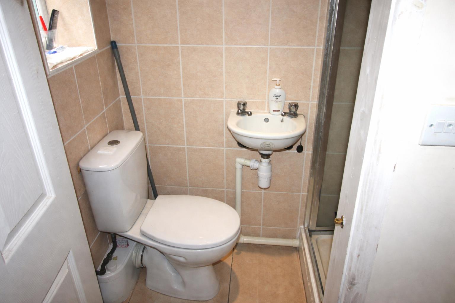 Suite comprising shower, WC and wash hand basin, double-glazed window to the rear.