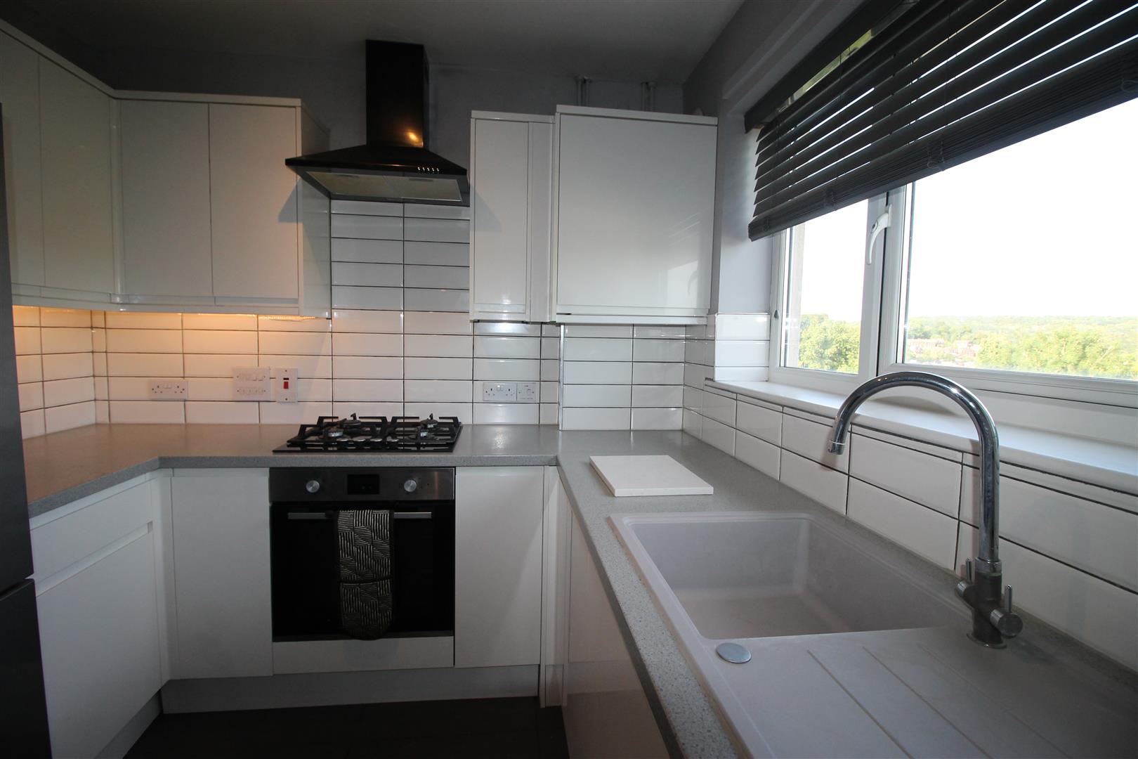 Newly fitted kitchen providing a range of wall and base level units, stainless steel sink with mixer tap, integrated oven and gas hob with overhood extractor fan, all around tiled walls, tiled flooring and double glazed window to side aspect.