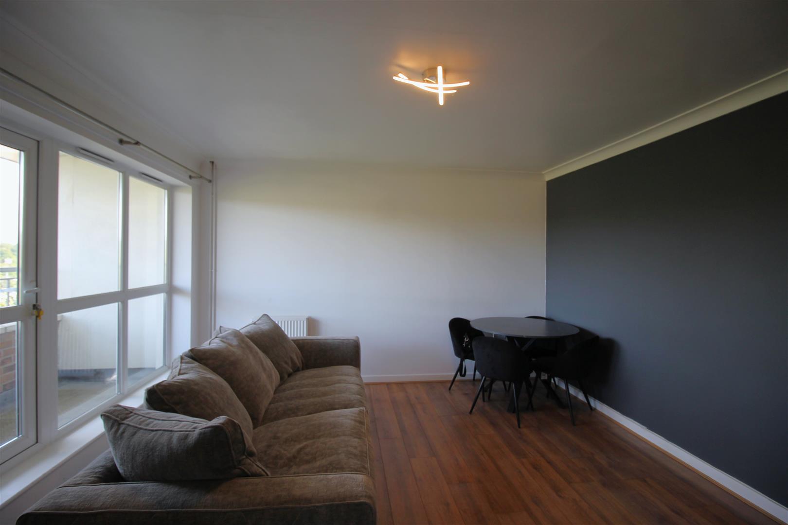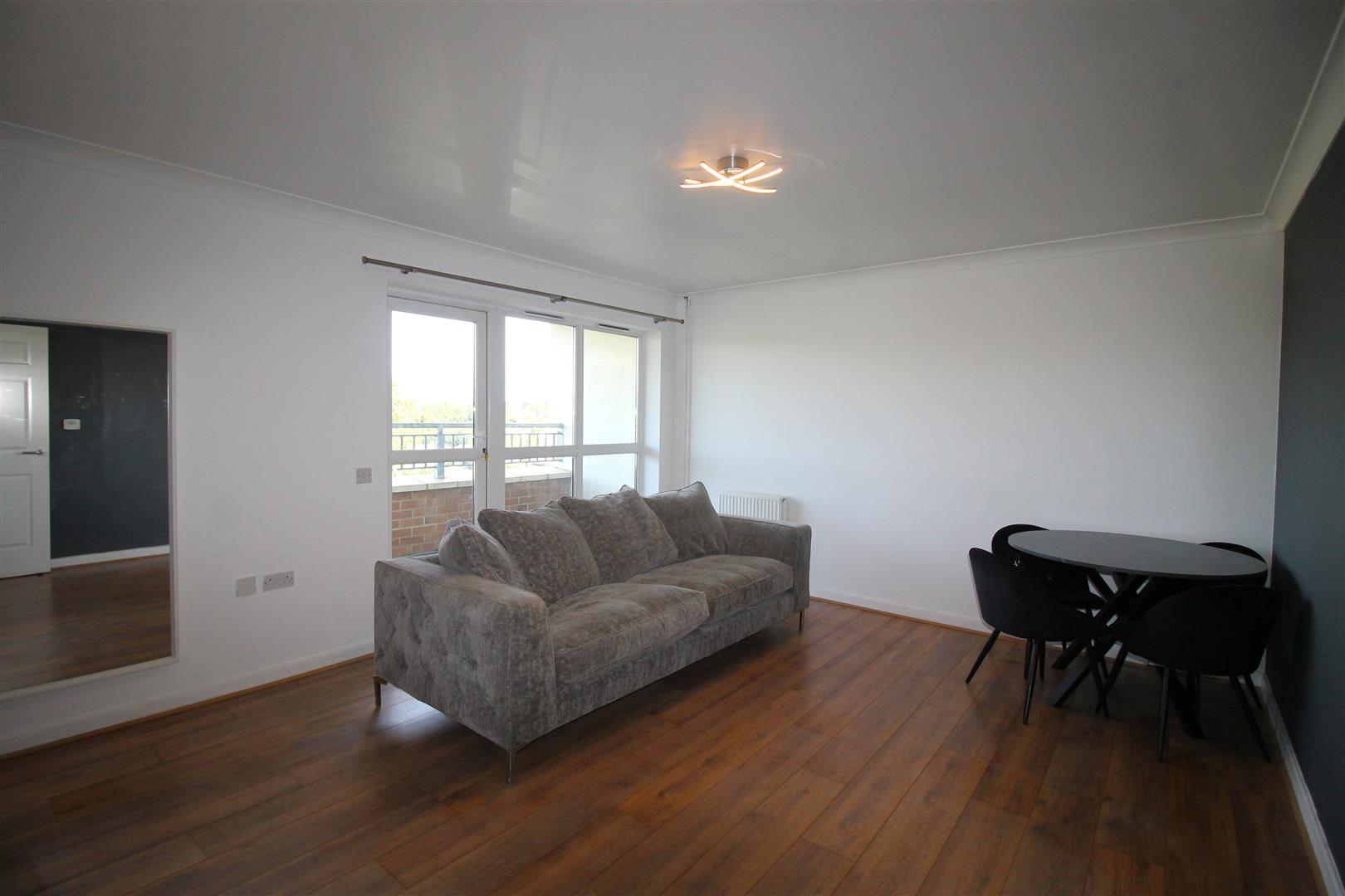 Spacious sitting/dining room with balcony, wooden flooring, radiator, double glazed patio doors leading to balcony, open plan access to kitchen.